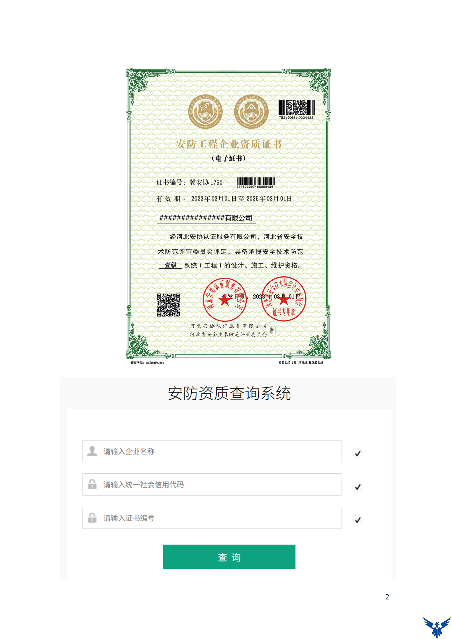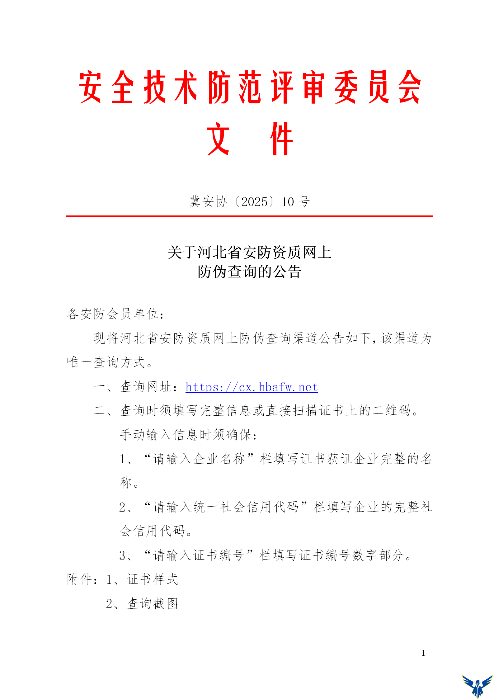 关于河北省安防资质网上防伪查询的公告各安防会员单位: 现将河北省安防资质网上防伪查询渠道公告如下,该渠道为唯一查询方式。 一、查询网址:https: cx hbafw net 二、查询时须填写完整信息或直接扫